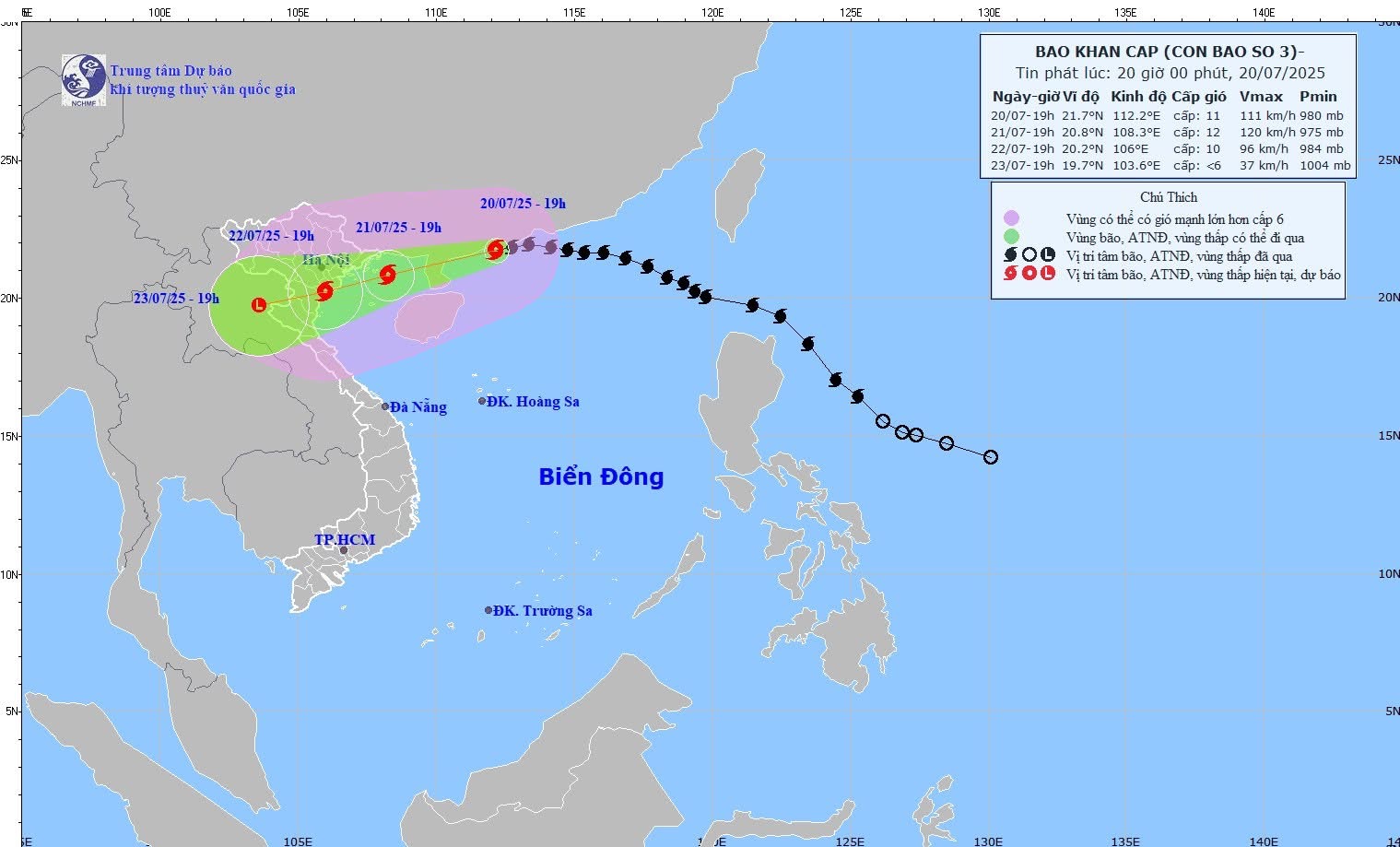📌Theo thông tin mới nhất từ Trung tâm Dự báo Khí tượng thủy văn, hồi 19 giờ ngày 20/7, tâm bão số 3 ở khoảng 21,7°N; 112,2°E, trên vùng biển phía Tây Bắc khu vực Bắc Biển Đông, cách Quảng Ninh–Hải Phòng khoảng 480km về phía Đông. Sức gió mạnh nhất cấp 11 (103–117km/h), giật cấp 14. Bão di chuyển theo hướng Tây, tốc độ khoảng 20km/h.