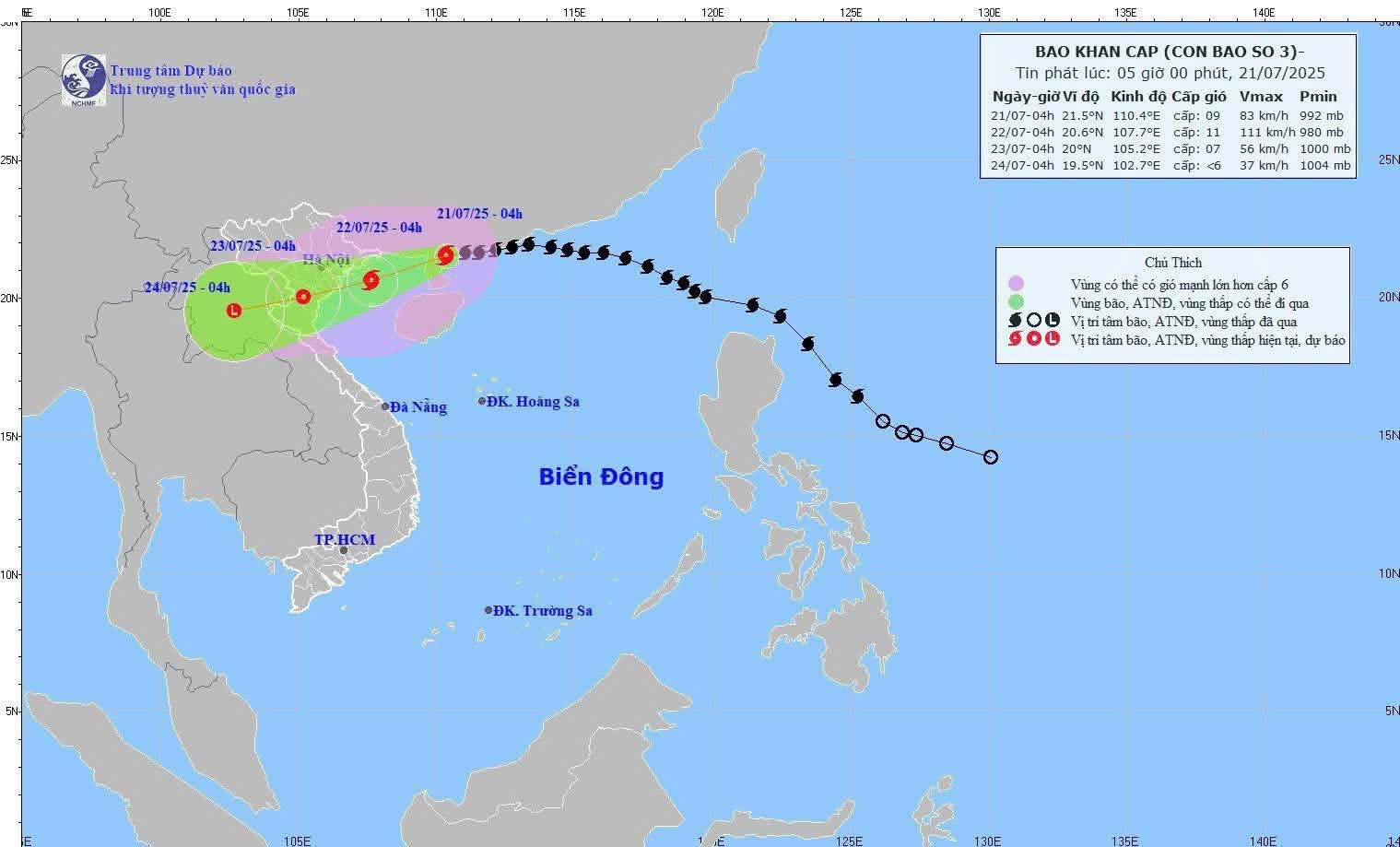 Dự báo trong sáng đến trưa nay, bão số 3 sẽ đi vào vịnh Bắc Bộ và có khả năng mạnh trở lại. Cụ thể, trong 24 giờ tới, bão di chuyển hướng Tây Tây Nam, khoảng 15km/h và có khả năng mạnh lên. Đến 4h sáng mai (22/7), ví trí tâm bão trên khu vực Bắc vịnh Bắc Bộ với cường độ cấp 10-11, giật cấp 14.