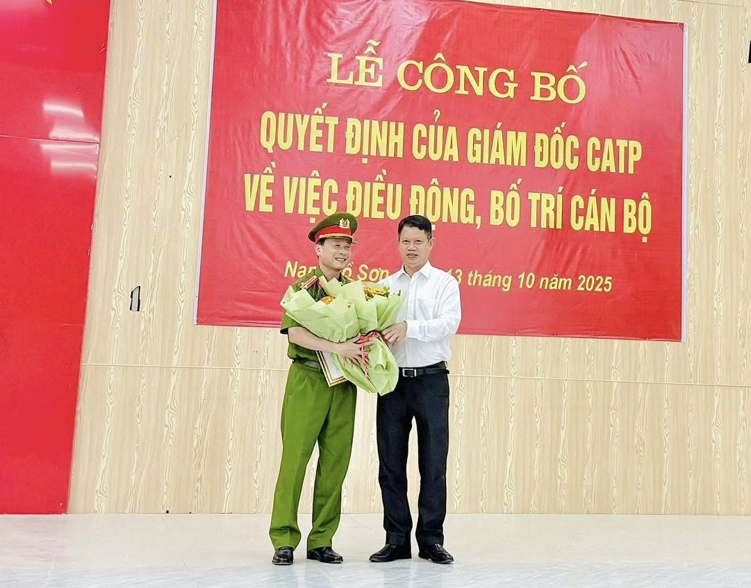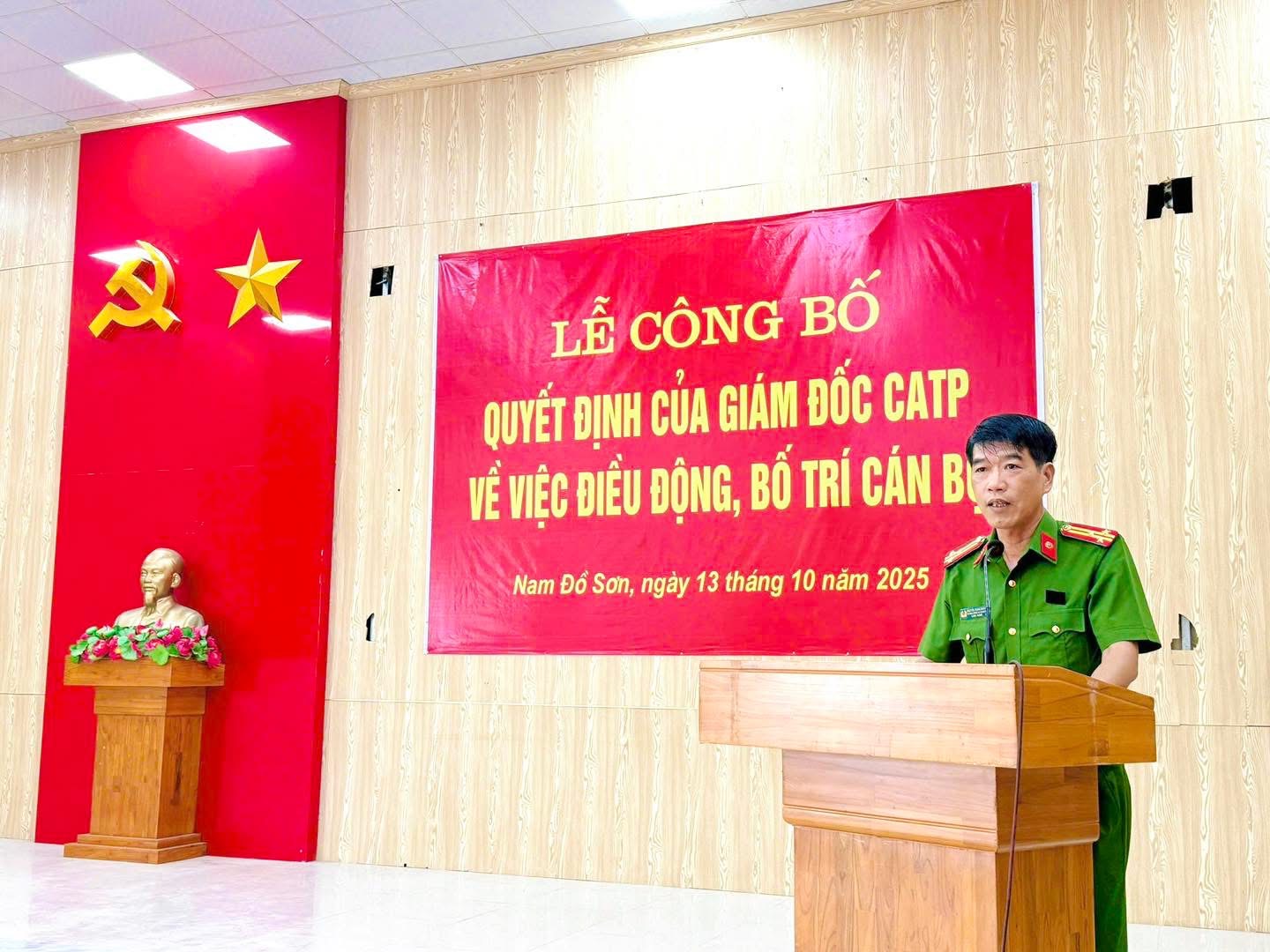 Ngày 13/10/2025, Công an phường Nam Đồ Sơn tổ chức Lễ công bố Quyết định của Giám đốc Công an thành phố về việc điều động cán bộ đối với đồng chí Nguyễn Trung Thành, Phó Trưởng Công an đặc khu Cát Hải, đến nhận công tác và giữ chức vụ Phó Trưởng Công an phường Nam Đồ Sơn.